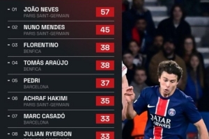 世俱杯竞猜-本赛季欧冠抢断数:巴黎内维斯57次、门德斯45次前二,佩德里37次