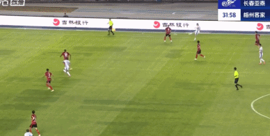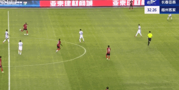 比赛第32分钟,梅州客家外援罗德里格在长春亚泰禁区内倒地,主裁判示意比赛继续(没有判罚点球)。随后,长春亚泰外援胡安-卡米洛头球破门打破僵局。