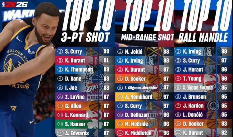 库里2K26能力值曝光:三分99遥遥领先 中投控球均达97 xiaoqiao 2025年09月11日 22:00 151 0 8月13日最新消息,知名体育媒体Hoop Muse披露了库里在《2K26》游戏中的部分能力值数据。数据显示:三分能力达到99分(全联盟最高)、中距离投篮97分(仅次于约基奇和欧文的98分)、控球能力97分(略低于欧文的99分)。